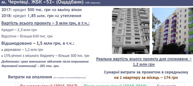 After all compensations, the project cost on average per apartment made up about 200 UAH per month.