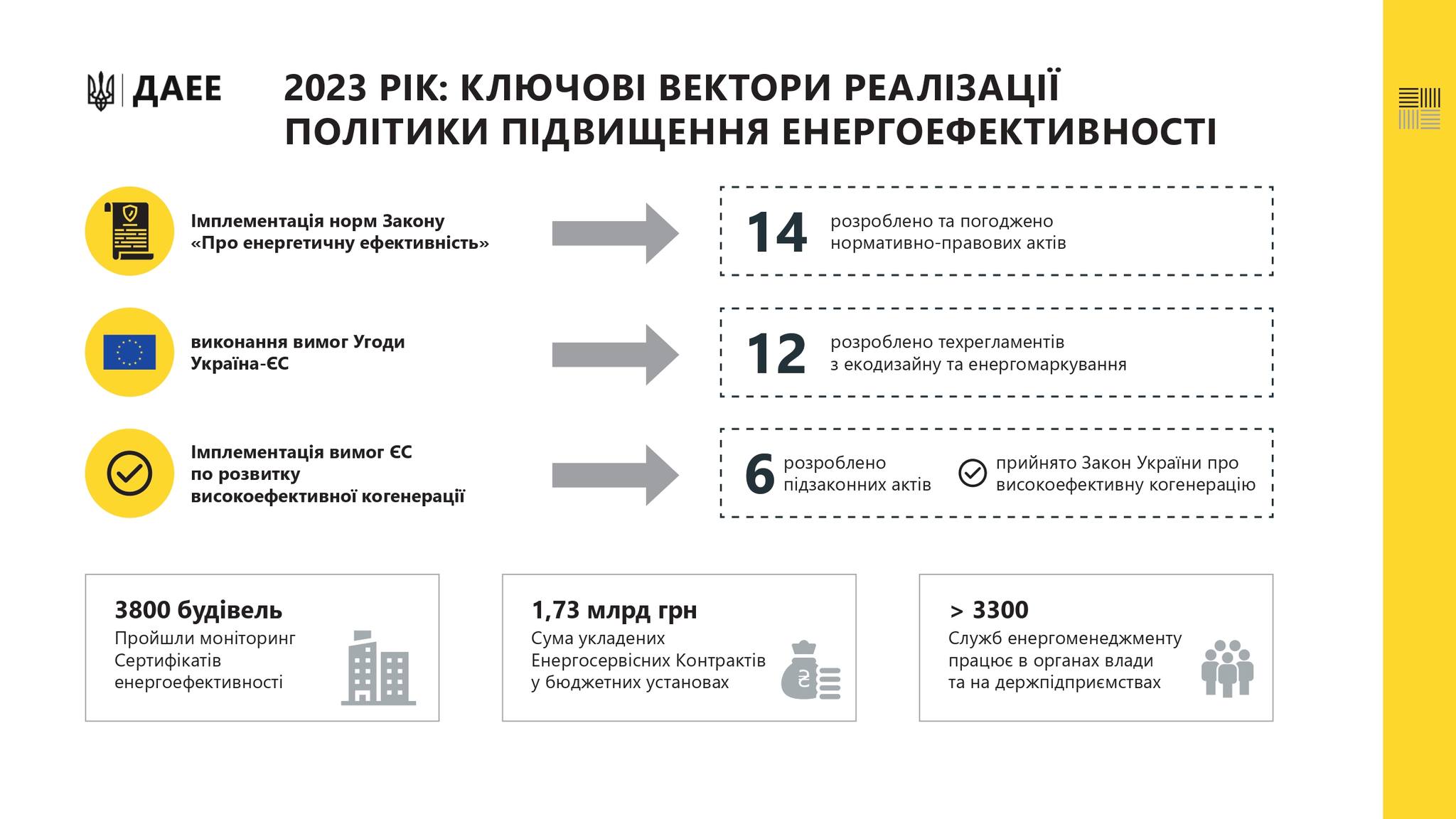 Regarding the implementation of the Law "On Energy Efficiency": 14 regulatory acts were developed and approved. To comply with the EU-Ukraine Agreement, in 2023 we developed 12 technical regulations on eco-design and energy labeling. To implement EU requirements for high-efficiency cogeneration development, there has been adopted the corresponding fundamental law, which foresees Ukraine's transition to high-efficiency cogeneration installations, and 6 by-laws have already been developed.