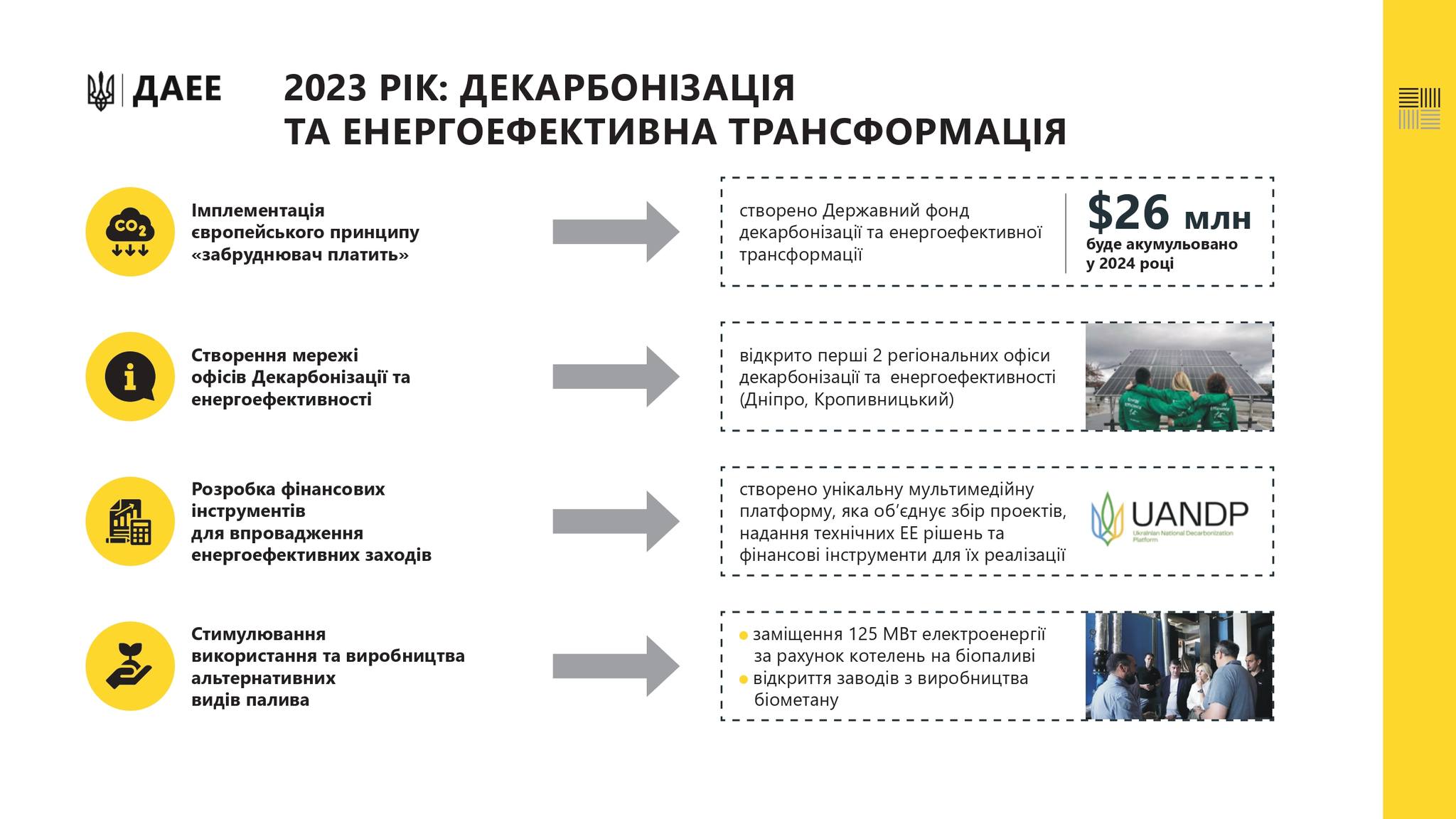 the Decarbonization Fund, as well as introducing other tools to stimulate energy-efficient transformation and the use of alternative fuels. In particular, it is planned to accumulate around $26 million for the operation of the State Decarbonization and Energy Efficiency Transformation Fund, expand the number of regional offices and stimulate the use of alternative fuels.