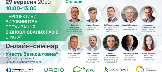 Онлайн-семінар відбудеться за підтримки проєкту REGATRACE “Торгівля відновлюваними газами в Європі” програми Horizon 2020 та програми ЄБРР та GEF «Україна: Сталі інновації у ланцюжку створення вартості в біоенергетиці».