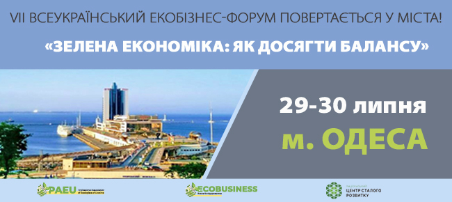 29-30 липня 2021 року Національний центр сталого розвитку (НЦСР) за підтримки Професійної асоціації екологів України, журналу «Ecobusiness. Екологія підприємства» та Одеського державного екологічного університету проводить Всеукраїнський ЕКОБІЗНЕС-ФОРУМ «Зелена економіка: як досягти балансу» Прагнемо не дискусій, а рішень!