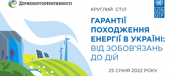 25 січня о 14:00 Держенергоефективності, за підтримки проєкту ПРООН Україна «Підтримка зеленого відновлення в Україні», організовує круглий стіл: «Гарантія походження енергії в Україні: від зобов’язань до дій».