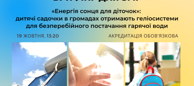 19 жовтня 2023 року о 13:20 в ІА «Укрінформ» відбудеться брифінг для ЗМІ з нагоди старту в Україні нового проєкту для громад «Енергія сонця для діточок».