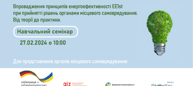 27 лютого 2024 року о 10:00 запрошуємо на вебінар «Впровадження принципів енергоефективності EE1st при прийнятті рішень органами місцевого самоврядування. Від теорії до практики».