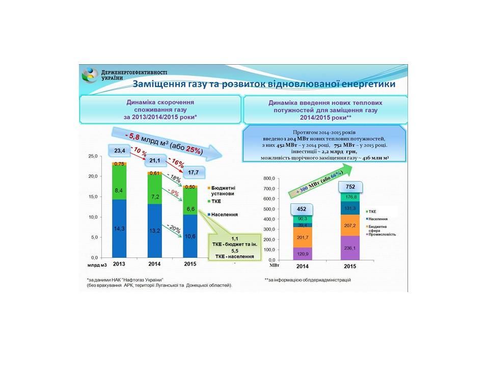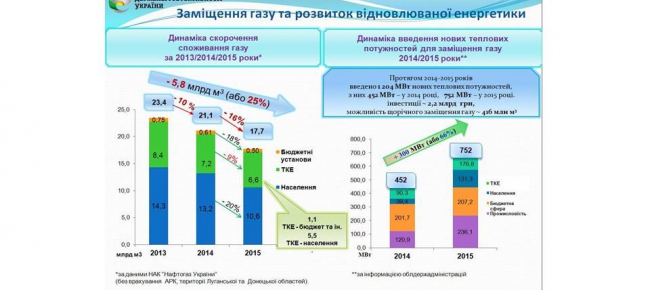 В ході виступу Сергій Савчук наголосив, що наразі найповільніші темпи зменшення та заміщення споживання газу спостерігаються у секторі теплокомуненерго (ТКЕ). У цій сфері спалюється близько 7 млрд м3 газу в рік. З них у 2015 році: 5,5 млрд м3 газу використано для обігріву населення; 1,1 млрд м3 газу – для бюджету та інших установ.
