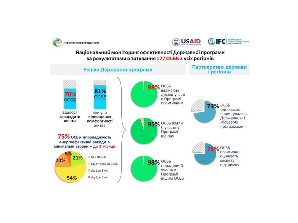 Крім того, Держенергоефективності разом з USAID та IFC було проведено опитування ОСББ з усіх областей України, що взяли участь у державній програмі та впровадили заходи з енергоефективності у 2015 році.