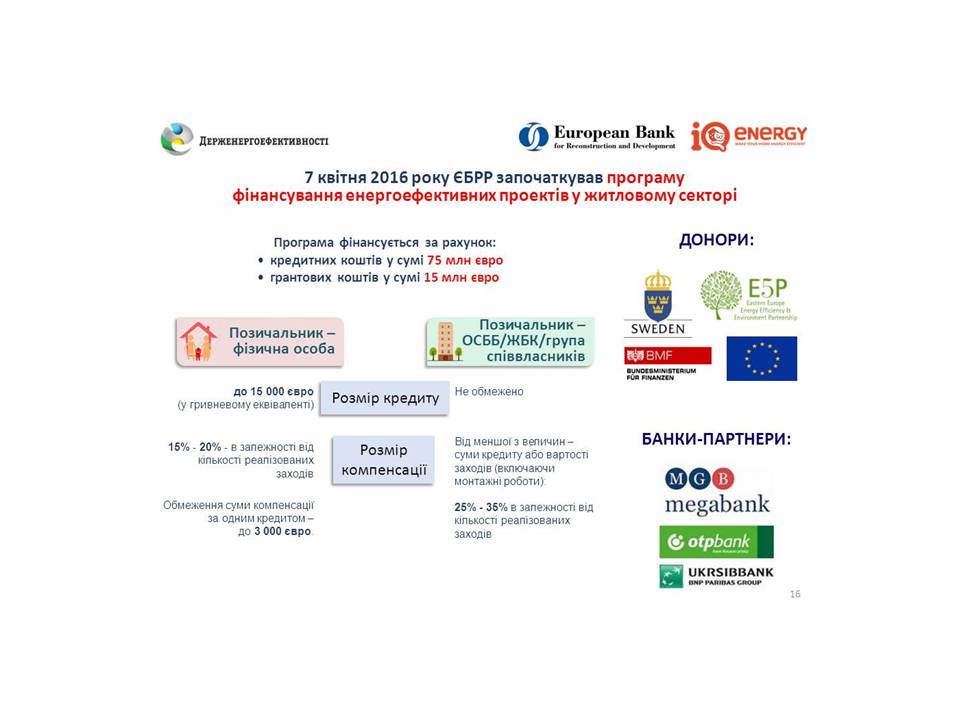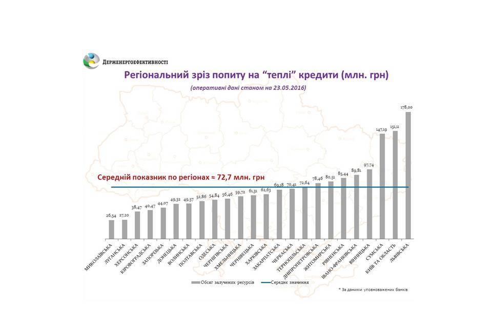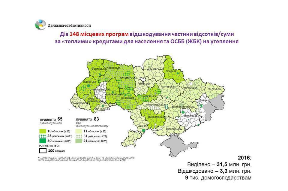 Так, на сьогодні вже прийнято 148 місцевих програм з відшкодування частини відсотків чи суми "теплих" кредитів для населення та ОСББ, в тому числі: 21 обласна, 76 районних, 51 міська. З них 65 програм (10 обласних, 25 районних, 30 міських), де виділено фінансування на 2016 рік. Загальний обсяг запланованого фінансування на 2016 рік становить близько 73 млн. грн., що у двічі більше ніж за 2015 рік.