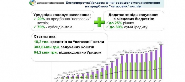 Нагадаємо, що Уряд надає населенню безповоротну фінансову допомогу через Ощадбанк, Укргазбанк та Укрексімбанк на придбання котлів, що працюють на інших крім газу та електроенергії видах палива, а саме – 20% відшкодування суми залученого кредиту, а для субсидіантів – 70%. Така програма була запроваджена ще у жовтні 2014 року.