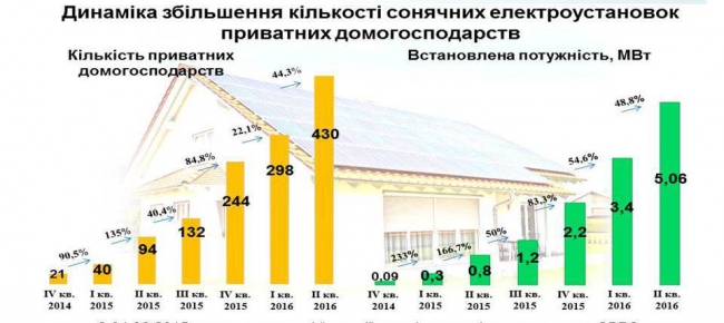 «Сьогодні вже 430 приватних домогосподарств встановили сонячні панелі загальною встановленою потужністю 5,06 МВт. Для порівняння за весь 2015 рік таких ініціативних домовласників було 244, а у 2014 році в десятки разів менше – лише 21», - прокоментував статистичні дані Голова Держенергоефективності Сергій Савчук.