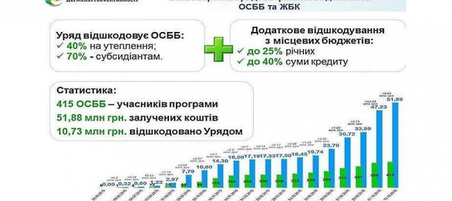 11 10 2016Попит на Урядову програму з енергоефективності з боку ОСББ залишається стабільно високим і за цей тиждень ними залучено 4,7 млн грн. на утеплення багатоповерхівок. За умовами програми з держбюджету їм належить відшкодування від 40% до 70% суми залучених кредитних коштів.