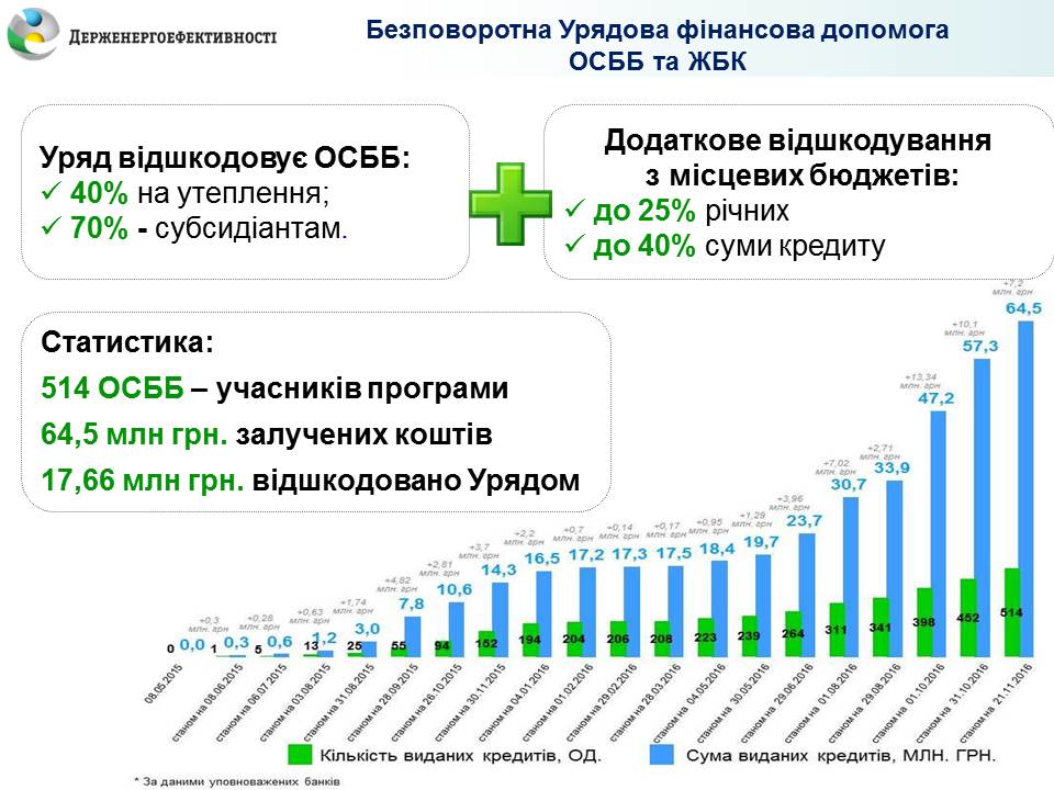 «Цієї осені попит на програму з боку ОСББ побив усі раніше зафіксовані рекорди. Щотижня за Урядовою допомогою почали звертатися не 5-10 ОСББ, а вдвічі більше - 15-20. Сьогоднішні результати моніторингу дії програми перевершили наші очікування: майже 30 ОСББ з різних регіонів країни залучили кредитні кошти на підвищення енергоефективності своїх будинків. Це найяскравіший доказ того, що мешканці багатоповерхівок усвідомили значущість проведення комплексних заходів з економії енергоресурсів, а також переваги участі у програмі, де майже половину витрат компенсує Держава», - повідомив Голова Держенергоефективності Сергій Савчук, коментуючи результати щотижневого моніторингу дії Урядової програми з енергоефективності.