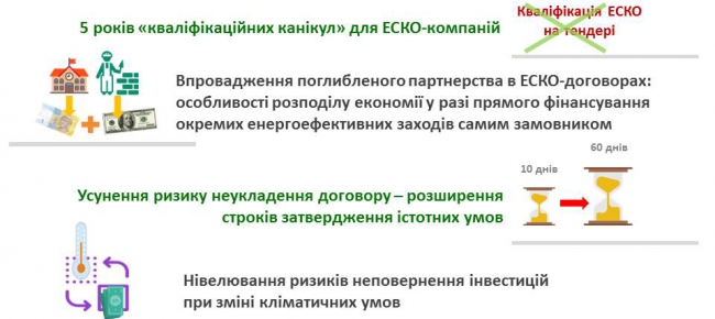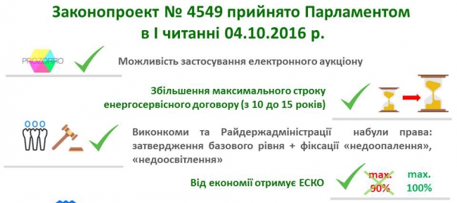 4 жовтня 2016 року Верховна Рада України прийняла за основу законопроект (реєстр. № 4549 від 29.04.2016 р.) про внесення змін до базового закону з енергосервісу - Закону України № 327-VIII від 09.04.2015 «Про запровадження нових інвестиційних можливостей, гарантування прав та законних інтересів суб’єктів підприємницької діяльності для проведення масштабної енергомодернізації».
