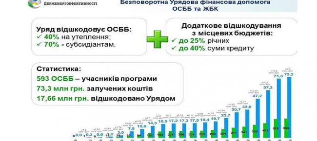 Нагадаємо, що з початку дії Урядової програми з енергоефективності 593 ОСББ скористалися нею та залучили більше 73,3 млн грн на реалізацію заходів з економії енергоресурсів. Станом на сьогодні, Уряд відшкодував їм близько 17,6 млн гривень.