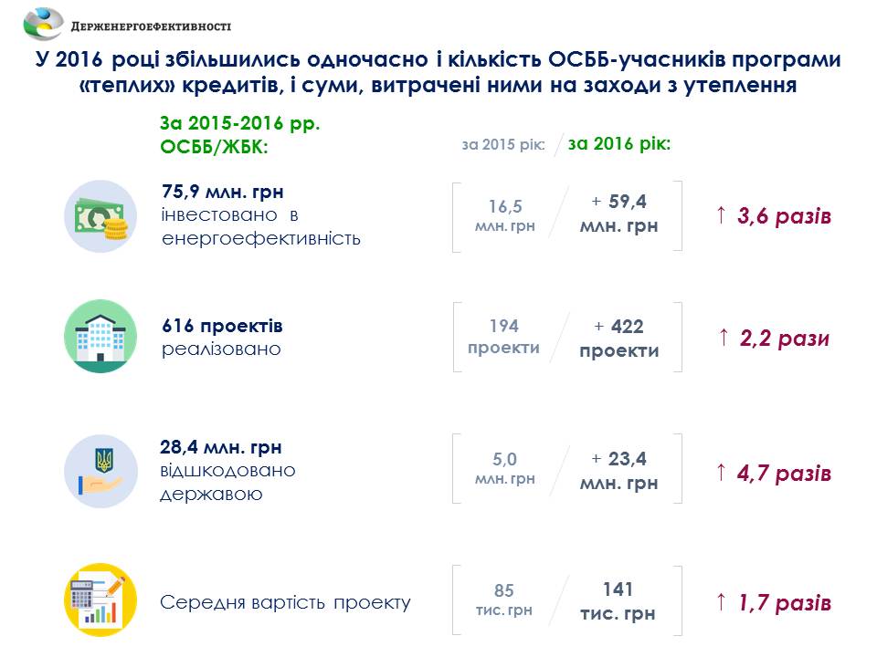 «Цьогоріч одночасно у 2-3 рази збільшилась і кількість ОСББ, які звернулися за Урядовою допомогою на утеплення житла, і суми коштів, залучених ними на енергомодернізацію. Так, якщо у 2015 році реалізовано 194 проекти з підвищення енергоефективності багатоквартирних будинків, то у 2016 році вже у 2,2 рази більше – 422 проекти. У 2015 році на ці цілі ОСББ залучили 16,5 млн грн. кредитних коштів, а в 2016 році у 3,6 разів більше – 59,4 млн гривень. Загалом, за два роки в утеплення багатоповерхівок інвестовано 75,9 млн грн коштів ОСББ-учасників програми», – повідомив Голова Держенергоефективності Сергій Савчук та додав, що держава, зі свого боку, за 2015-2016 рік відшкодувала цим ОСББ 28,4 млн гривень.