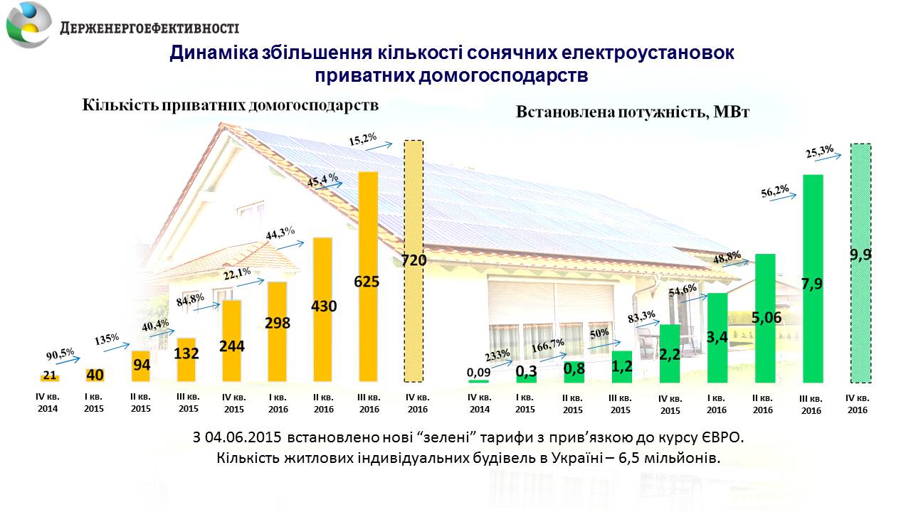Варто зауважити, що в Україні з моменту встановлення у 2015 році "зеленого" тарифу на закупівлю електроенергії, вироблену установками потужністю до 30 кВт, стрімко зростає кількість домогосподарств, які переходять на "чисті" джерела. Ще у 3-ому кварталі 2015 році зафіксовано збільшення їх кількості на 40%, у 4-ому кварталі того ж року – вже на 84%. Подібна динаміка зберіглася і у 2016 році. Як бачимо, чимало українців усвідомлюють переваги використання відновлюваних джерел енергії, а Держава готова їм у цьому допомогти.