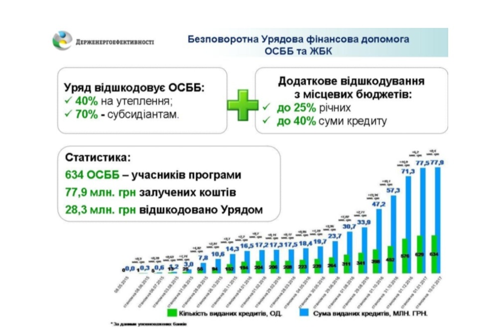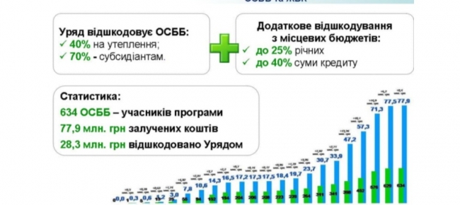Так, у 2016 році ОСББ реалізовано 435 проектів з підвищення енергоефективності у багатоповерхівках, що у 2,2 рази більше ніж у 2015 році. На ці цілі ними залучено 61 млн гривень, що у 3,6 разів більше ніж у 2015 році.