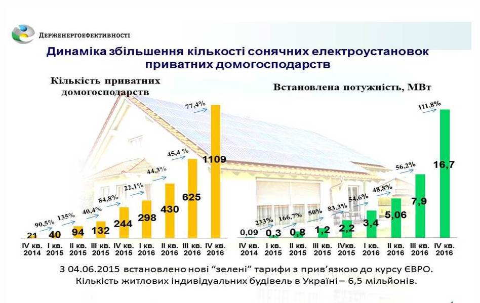 «Сьогодні саме час активізуватися у цьому напрямку, оскільки попит на сонячні електроустановки стрімко зростає. Так, у 2016 році кількість домогосподарств, що використовує «сонячну» електроенергію, збільшилася майже у 4 рази порівняно з 2015 роком, а саме - з 244 до 1109 домогосподарств. Водночас, обсяг потужностей встановлених сонячних панелей зріс майже у 7 разів: з 2,2 МВт станом на кінець 2015 року до 16,7 МВт наприкінці 2016 року»,  - нагадав Голова Держенергоефективності.