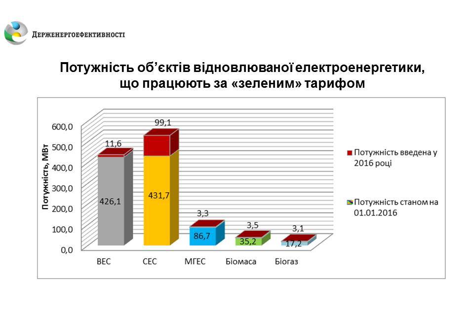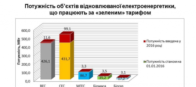 Загалом, станом на 1 січня 2017 року в Україні встановлена потужність об’єктів, що виробляють електроенергію з відновлюваних джерел та працюють за «зеленим» тарифом, становить 1,1 ГВт. У 2016 році цими об’єктами було вироблено понад 1,7 млрд кВт*год електроенергії.