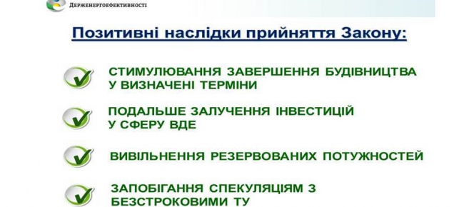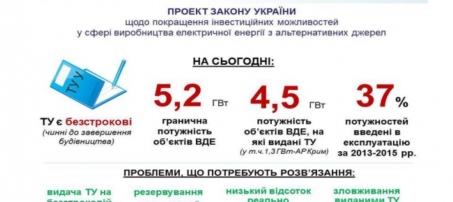 «Законопроект вирішує так звану проблему безстрокового «резервування» потужностей, які не використовуються. Справа в тому, наразі з можливих 5,2 ГВт потужностей об’єктів відновлюваної енергетики вже на 4,4 ГВт видано технічних умов на приєднання. При цьому, будівництво більшості об’єктів навіть не розпочато. Все це зумовлено безстроковою дією технічних умов на приєднання об’єктів до мереж», - прокоментував Голова Держенергоефективності Сергій Савчук та додав, що, як наслідок, на ринку виник штучно створений дефіцит потужностей для підключення нових об’єктів відновлюваної енергетики.