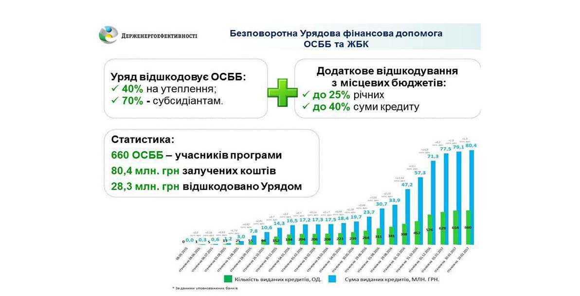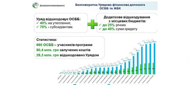 «Усім ОСББ та ЖБК, які прагнуть модернізувати свої будинки, встановити ІТП, замінити вікна в під’їздах тощо, Держава надає безповоротну фінансову допомогу на енергоефективні заходи. З державного бюджету надається відшкодування від 40% до 70% суми «теплого» кредиту, з місцевих бюджетів – ще частина відсотків чи суми кредиту, - пояснив Голова Держенергоефективності Сергій Савчук. - У тому, що таке співфінансування з різних джерел вигідне, переконалося вже 660 ОСББ. Вони скористалися програмою «теплих» кредитів і залучили більше 80 млн гривень на утеплення житла».