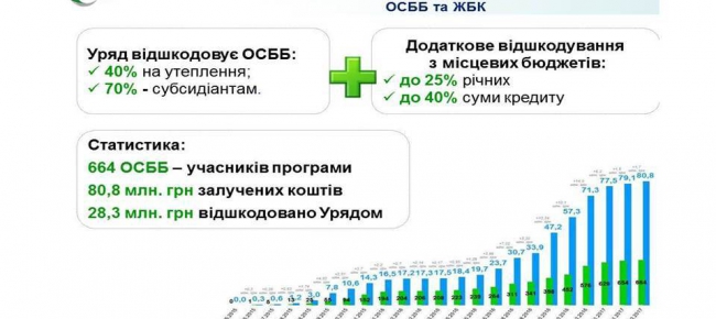«За січень-лютий 2017 року ОСББ та ЖБК залучили 3,3 млн грн. на впровадження енергоефективних заходів у своїх будинках. Це у 4 рази більше ніж за аналогічний період 2016 року, - повідомив Сергій Савчук. – Зросла і кількість ОСББ, які беруть участь у програмі. У 2017 році маємо вже 33 ОСББ-учасника, тоді як минулого року у цей період – тільки 12».