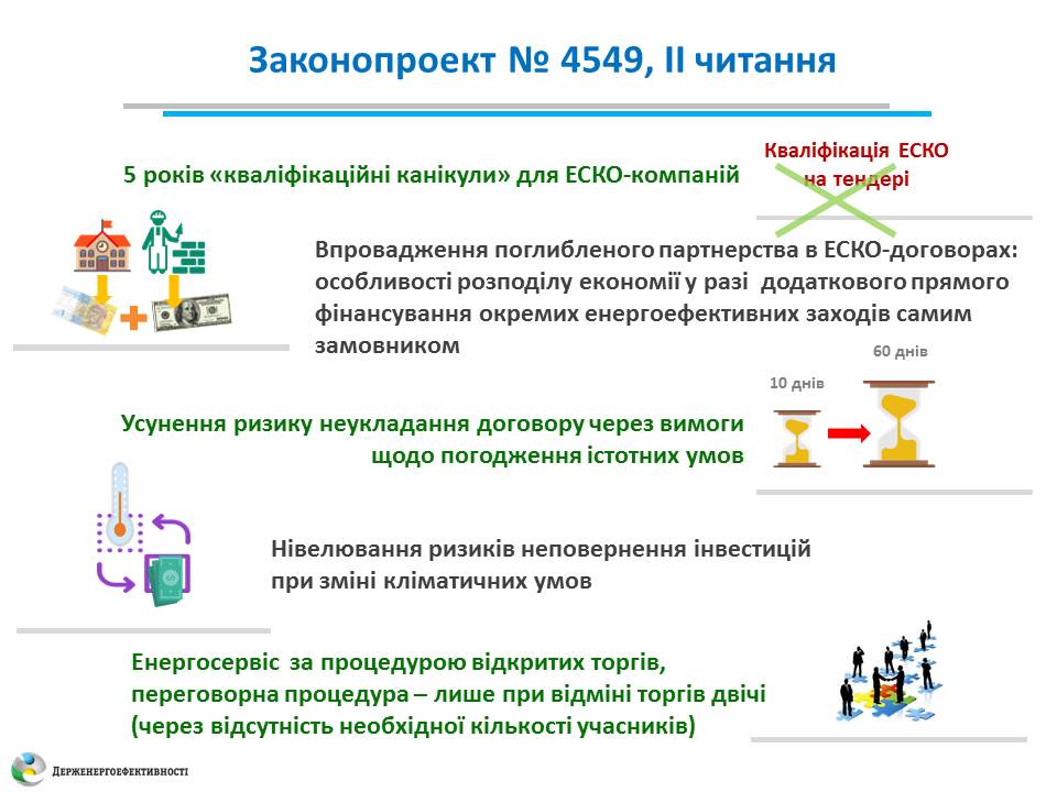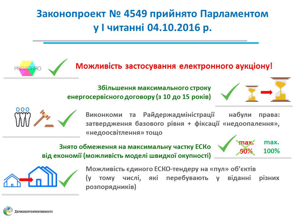 "На сьогодні завдяки прийнятій ще у 2015 році законодавчій базі тривають роботи за 19-ма укладеними ЕСКО-договорами на загальну суму 7 млн. грн. Інвестори вже почали повертати свої вкладення. Втім, щоб ліквідувати всі законодавчі бар’єри на шляху розвитку цього ринку та удосконалити діючий ЕСКО-механізм розроблено законопроект №4549. Цим проектом Закону передбачається забезпечити можливість застосування електронних аукціонів та майданчика PROZORRO для закупівель енергосервісу", - прокоментував Голова Держенергоефективності Сергій Савчук.