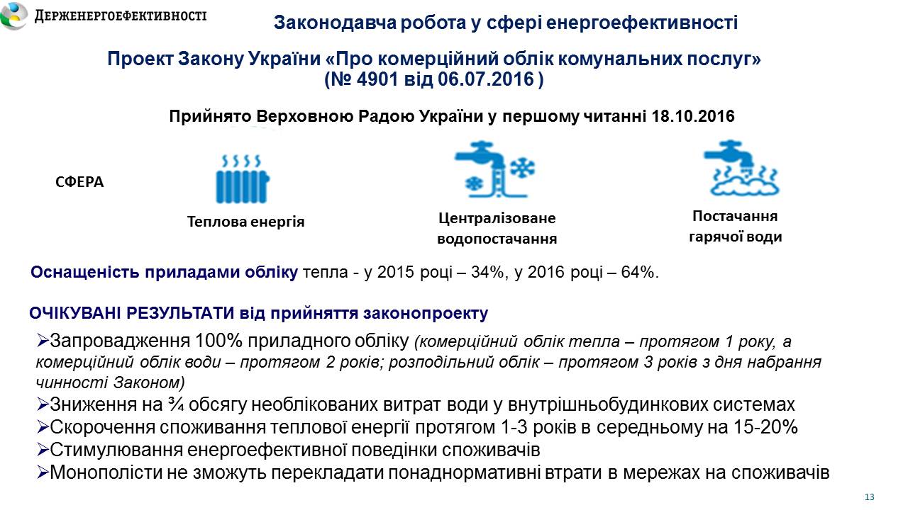 «Прийняття законопроекту стане першим головним кроком у реформуванні відносин у сфері житлово-комунального господарства, у стимулюванні населення до енергоефективності», - прокоментував важливість проекту Закону Голова Держенергоефектиності Сергій Савчук та запевнив, що без обліку неможливо ефективно впроваджувати заходи з економії ресурсів.