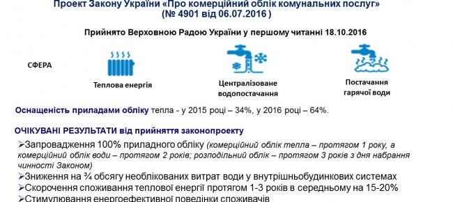 Цей законопроект має на меті запровадити в Україні обов’язковий приладний комерційний облік комунальних послуг (на вході в будівлю), а також розподільний облік (поквартирний).