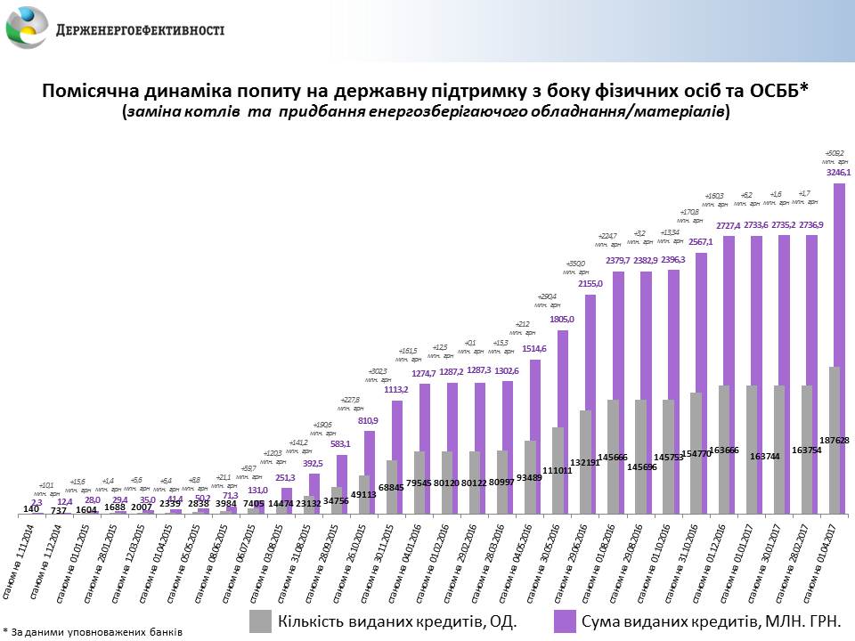 04 04 2017У березні понад 25 тисяч родин стали учасниками Урядової програми "теплих" кредитів та залучили на реалізацію енергоефективних заходів у своїх оселях 509 млн гривень. Це абсолютний рекорд, досягнутий вперше за три роки дії програми. Ця сума коштів у півтора рази та навіть удвічі перевищує показники кращих періодів програми. Наприклад, у листопаді 2015 року за місяць сім'ї отримували разом близько 300 млн гривень.
