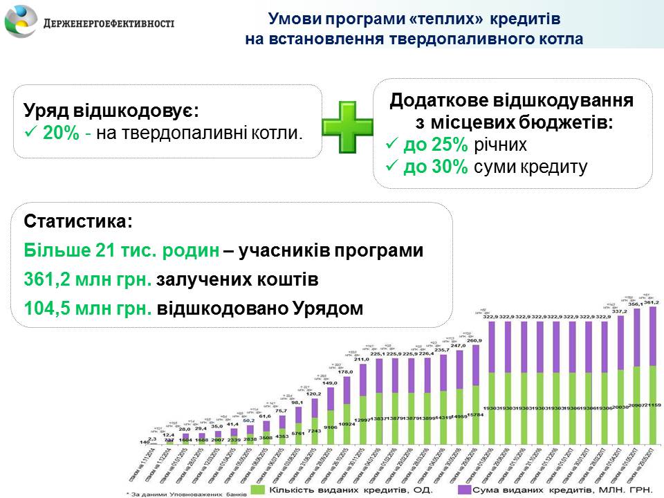 З початку дії Урядової програми «теплих» кредитів нею скористалося понад 20 тисяч родин саме з метою встановлення твердопаливних котлів. Зокрема, у травні ще 252 родини залучили 5,1 млн грн. на придбання «негазових» котлів. Про це повідомив Голова Держенергоефективності Сергій Савчук, аналізуючи дані щотижневого моніторингу дії програми.