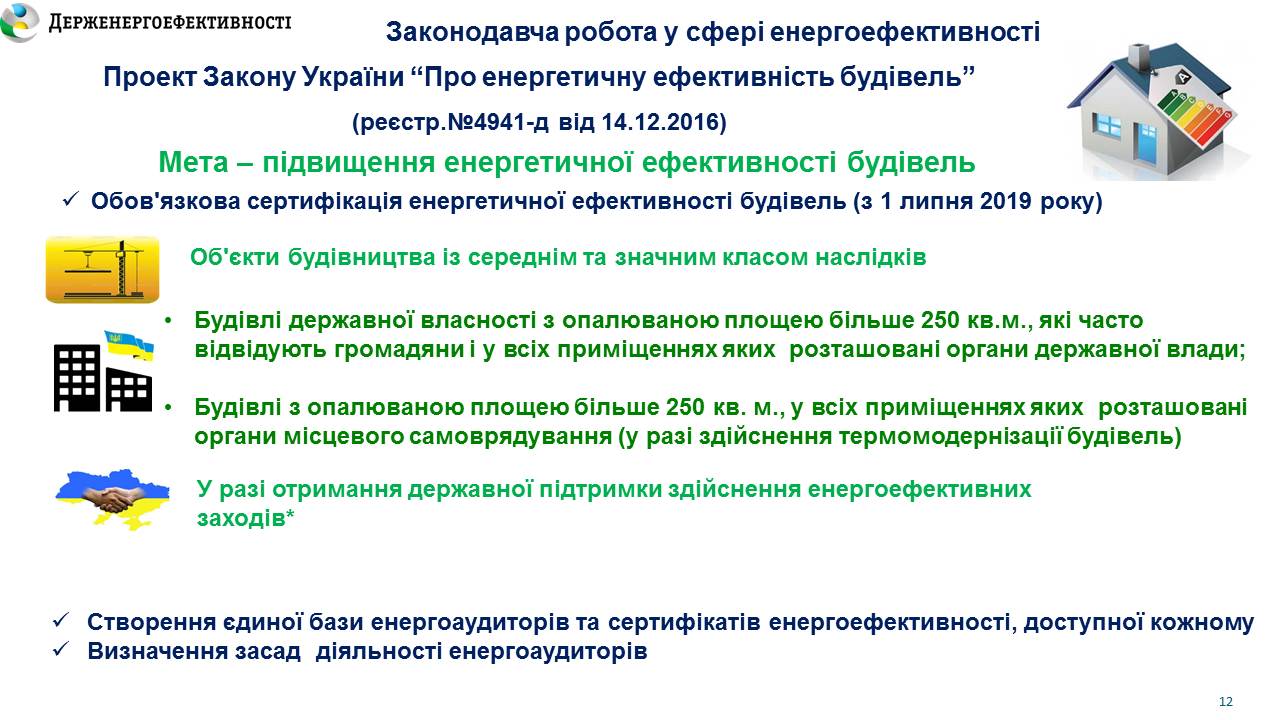 Законопроект про енергетичну ефективність будівель має на меті створити умови для скорочення енергоспоживання у будівлях. Саме цей сектор споживає найбільше енергії і водночас має найбільший потенціал енергозбереження. Одне з ключових нововведень законопроекту – сертифікація енергетичної ефективності будівель.