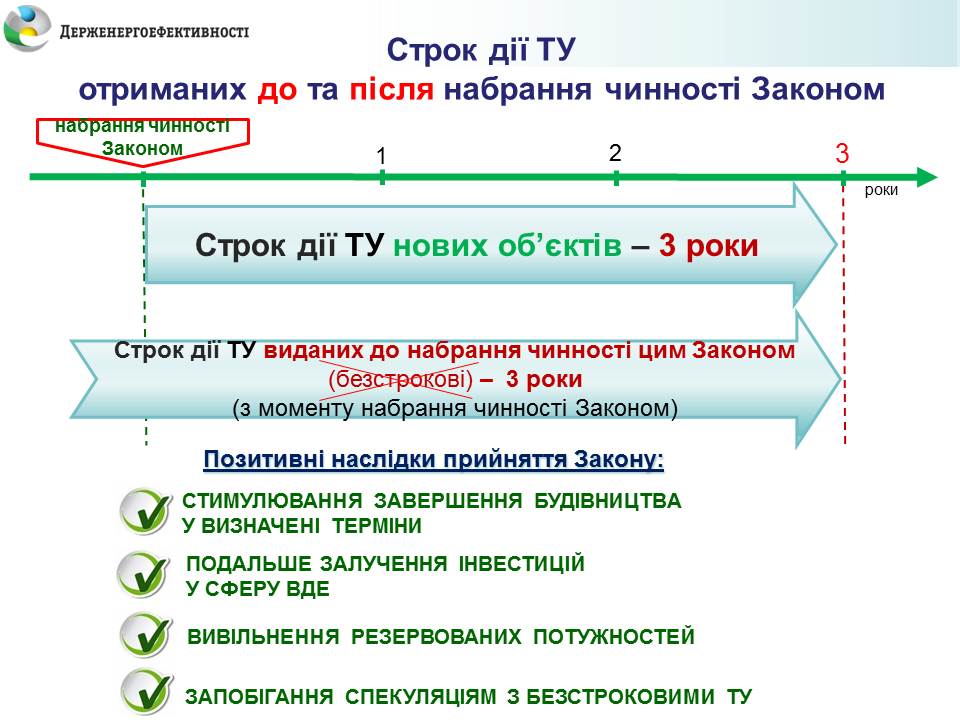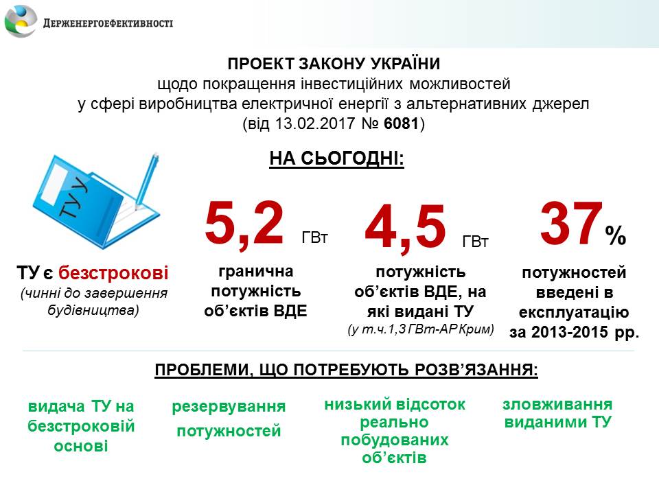 Третій законопроект №6081 має на меті полегшити підключення об’єктів з відновлюваної енергетики до мереж та вирішити проблему «безстрокового резервування потужностей». Законопроектом пропонується встановити трирічний період дії технічних умов на приєднання до мереж. Це стимулюватиме інвесторів вчасно завершувати будівництво об’єктів та дозволить розблокувати більше 4 ГВт зарезервованих потужностей об’єктів відновлюваної енергетики.