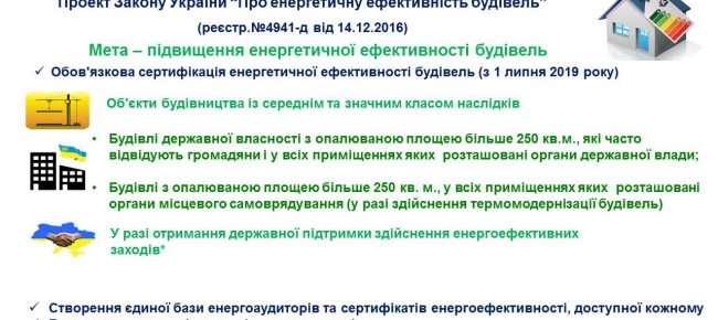 Цим Законом унормовано питання встановлення мінімальних вимог до енергетичної ефективності будівель та передбачено запровадження сертифікації енергетичної ефективності. Сертифікація забезпечить власників актуальною інформацією про енергетичні характеристики будівель, а також дозволить удосконалити механізми контролю за державними програмами енергоефективності, посилити їх ефективність.