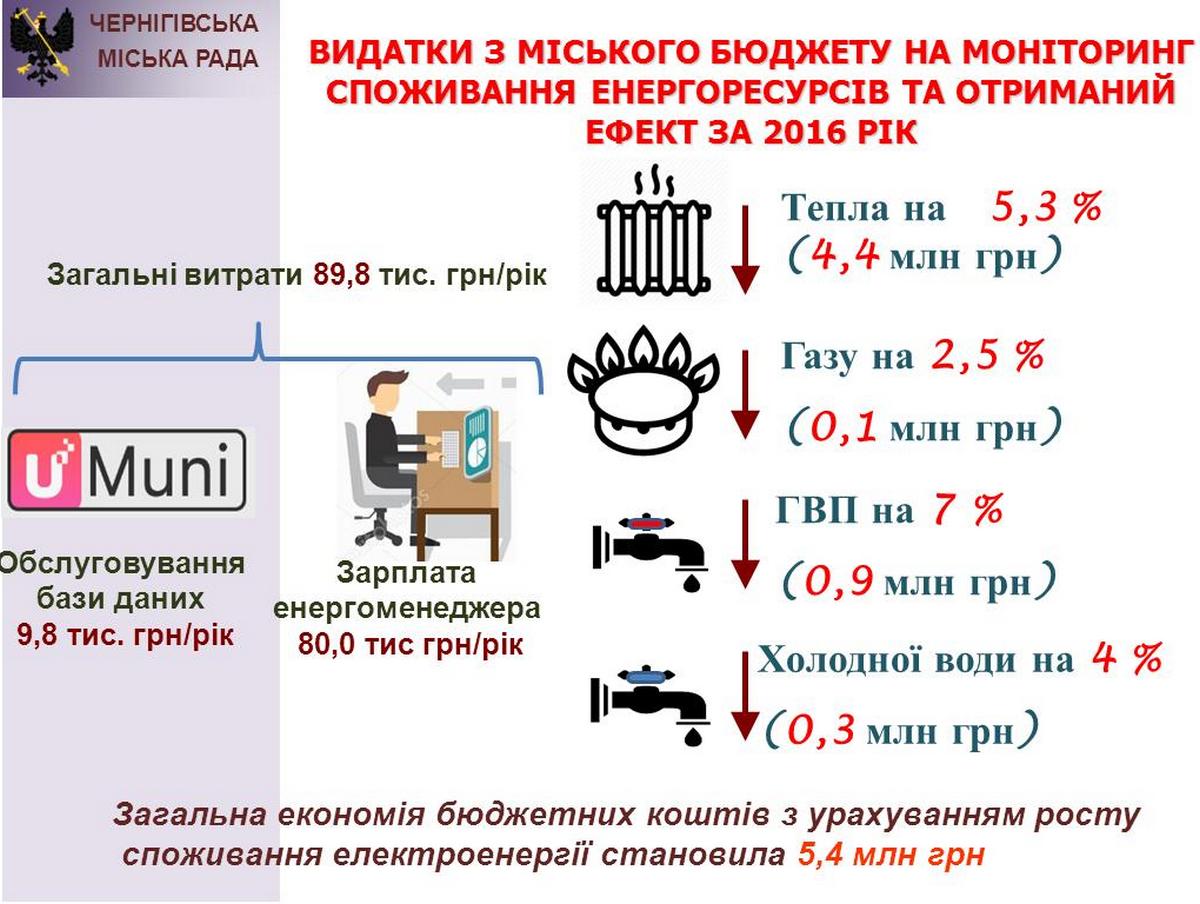 Також у ході семінару було відзначено, що у місті Чернігові запроваджено енергомоніторинг. Наприклад, у 2016 році завдяки цьому вдалося зекономити понад 5 млн грн. бюджетних коштів. Взяв приклад з Чернігова і Ніжин. На сьогодні у цьому місті енергомоніторинг впроваджено у більше 100 об’єктах, а це - понад 90% бюджетних установ міста.
