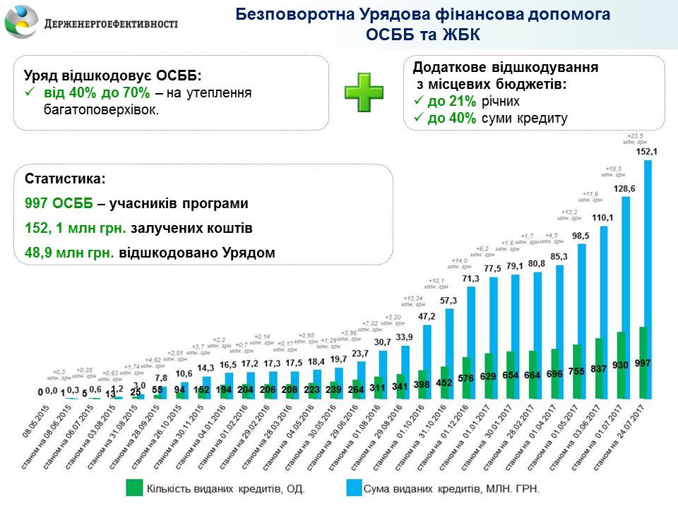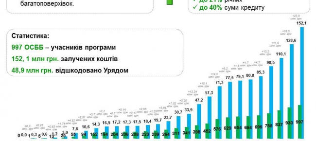 Загалом з початку дії програми «теплих кредитів» нею скористалося 997 ОСББ. Вони залучили понад 152 млн грн. на впровадження різних енергоефективних заходів: утеплення, заміну вікон на енергоефективні у під’їздах, встановлення ІТП, модернізацію освітлення тощо.
