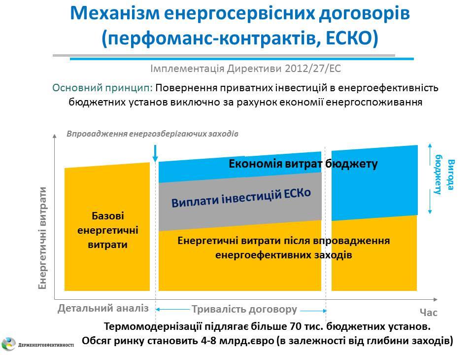 «Окрім підготовки законодавчої бази для ЕСКО-механізму та просвітницької роботи у регіонах, ми ініціювали створення бази потенційних об’єктів енергосервісу. Ця база – першоджерело інформації для інвестора, завдяки якій він може порівняти енергоспоживання різних установ та обрати найбільш інвестиційно-привабливі об’єкти для впровадження енергоефективних заходів», - прокоментував Голова Держенергоефективності Сергій Савчук.