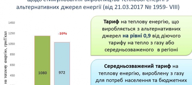 Нагадаємо, що вищезазначеним Законом запроваджено в Україні стимулюючий тариф для виробників тепла «не з газу». Він становитиме 90 % від діючого для суб’єкта господарювання тарифу на тепло з газу для потреб населення та бюджетних установ. У разі його відсутності тариф складе 90% середньозваженого тарифу на теплову енергію, вироблену з використанням газу, для потреб відповідної категорії споживачів.