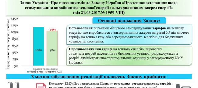 Це рішення є необхідним для належного виконання Закону України від 21.03.2017 №1959-VIII, яким запроваджується стимулюючий тариф на тепло з альтернативних джерел (http://zakon2.rada.gov.ua/laws/show/1959-19). Відповідно до Закону виробники тепла з альтернативних джерел енергії отримають: