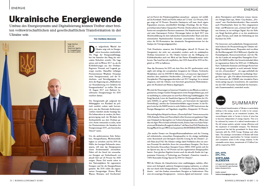 Більше інформації про те, яку роль відіграє розвиток «чистої» енергетики та сфери енергоефективності у новій енергетичній стратегії України, читайте у статті «Ukrainische Energiewende» журналу «Business & Diplomacy»: https://old.saee.gov.ua/sites/default/files/Ukrainische_Energiewende_Sv.Alexeeva_BD_3_2017.pdf