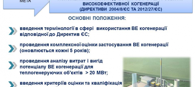• проведення комплексної оцінки застосування високоефективної когенерації (оновлюється кожні 5 років);