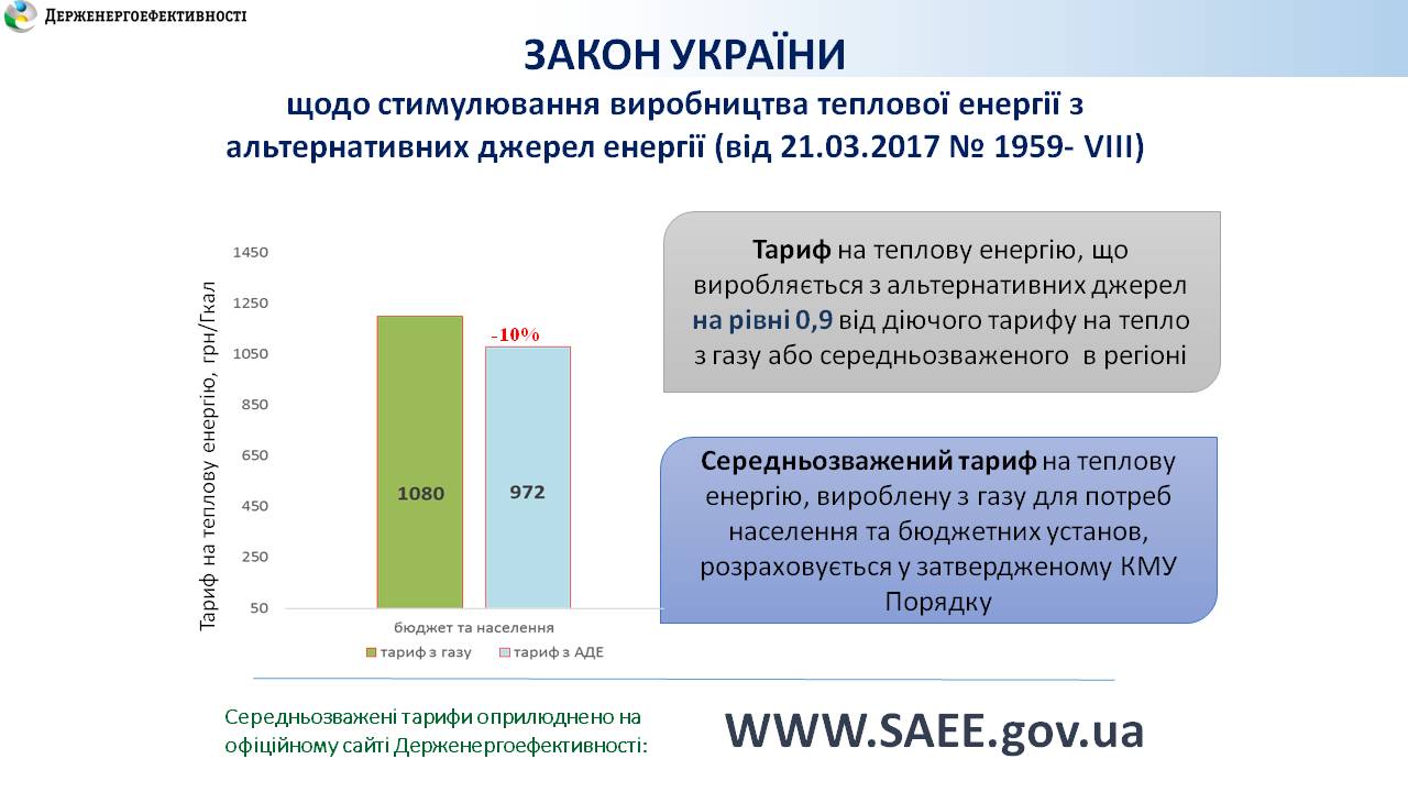 Нагадаємо, що Законом України щодо стимулювання виробництва тепла з відновлюваних джерел (http://zakon0.rada.gov.ua/laws/show/1959-19) запроваджено спрощену та прозору процедуру встановлення тарифів на тепло «не з газу».
