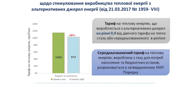 Відповідно до цих розрахунків органи місцевого самоврядування можуть встановлювати підприємствам тарифи на теплову енергію з відновлюваних джерел на рівні 90% від оприлюднених середньозважених тарифів.