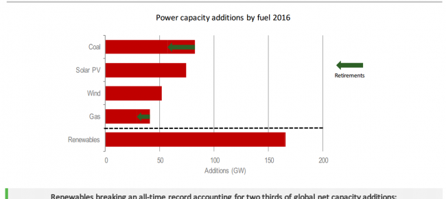 Так, майже дві третини електрогенеруючих потужностей, введених у 2016 р., - це об’єкти, які працюють на «чистих» джерелах енергії. Це близько 165 ГВт. З них 74 ГВт – це сонячна енергетика.