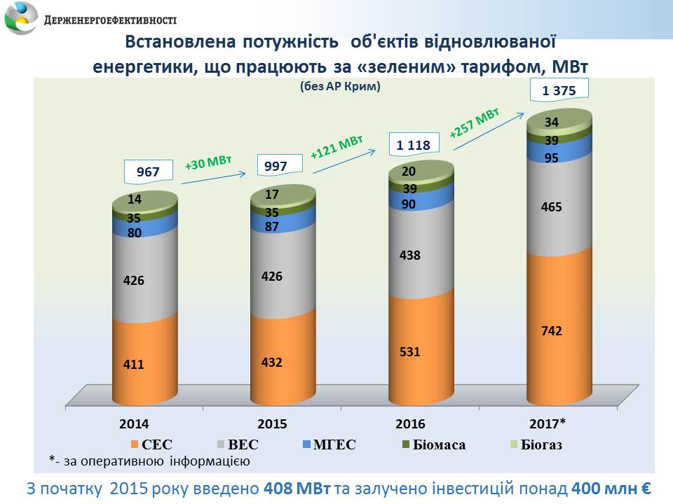 На кінець 2017 р. в Україні встановлена потужність об’єктів відновлюваної електроенергетики, які працюють за «зеленим» тарифом (без урахування окупованої території АР Крим), склала 1374,7 МВт.