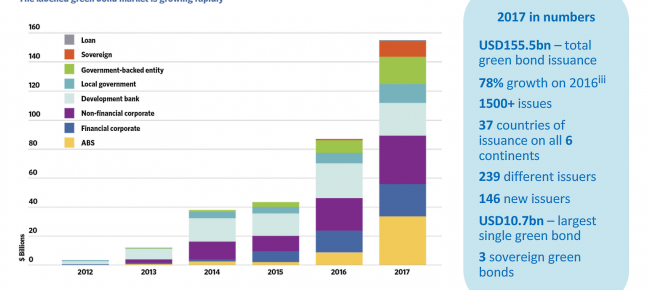 Ринок «зелених» облігацій у світі розвивається дуже швидкими темпами. Загальний обсяг розміщення цих цінних паперів у 2017 р. сягнув 155 млрд. доларів, що майже удвічі більше, ніж у попередньому році, та у 180 разів більше, ніж 10 років тому.