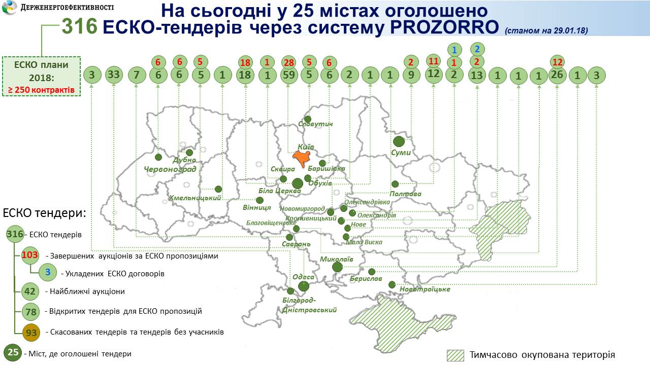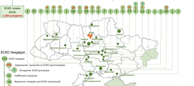 «Все більше органів місцевого самоврядування проявляють активність у впровадженні ЕСКО-механізму, обирають установи для енергосервісу та налагоджують співпрацю із інвесторами. Так, у базі потенційних ЕСКО-об’єктів, розміщеній на сайті Держенергоефективності (https://old.saee.gov.ua/uk/content/energoservis_1), налічується понад 12 тис. установ, що потребують термомодернізації. У 25 містах оголошено вже 316 ЕСКО-тендерів через систему PROZORRO (https://prozorro.gov.ua). З них 103 аукціони вже завершено. Найближчим часом очікується укладання чергових ЕСКО-договорів», - прокоментував Голова Держенергоефективності Сергій Савчук.