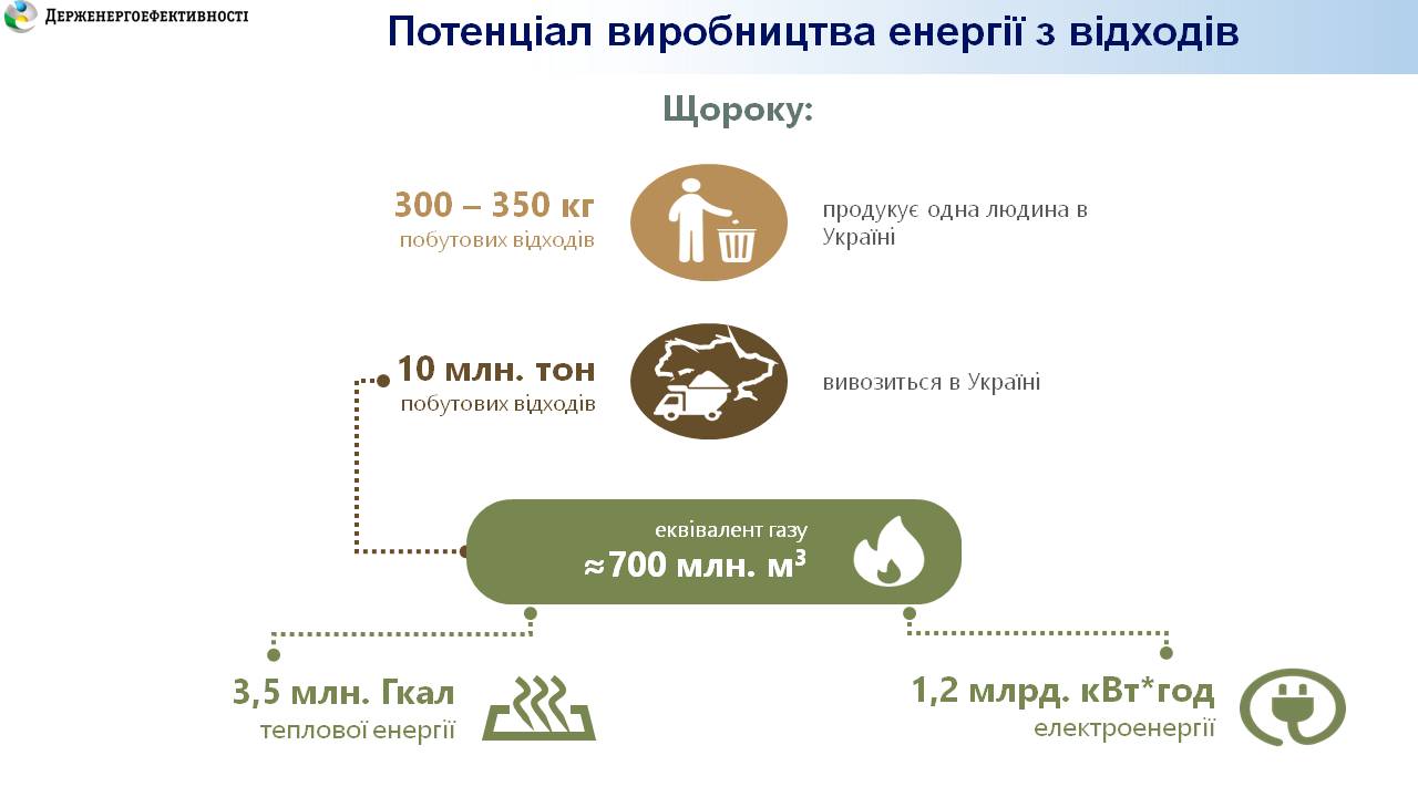 Із 10 млн тонн сміття можна виробляти 3,5 млн Гкал тепла та 1,2 млрд кВт*год електроенергії у рік. Це дозволить заміщувати до 1 млрд м3 газу щорічно.