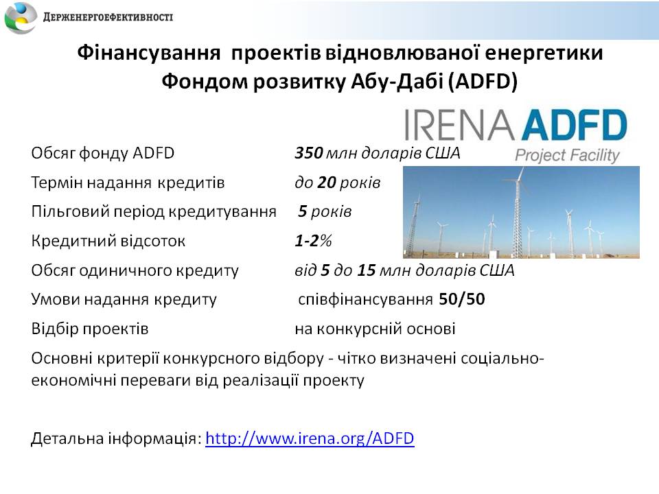 - подавати заявки до Фонду розвитку Абу-Дабі (https://www.adfd.ae) щодо отримання пільгових кредитів на «зелені» проекти (під 1-2 % терміном до 20 років, включаючи 5-річний пільговий період, за умови співфінансування 50% вартості проекту);