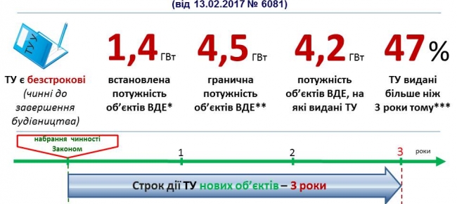 На сьогодні із можливих 4,5 ГВт потужностей об’єктів відновлюваної електроенергетики вже зарезервовано 4,2 ГВт. На даний час з цих потужностей, на які видано технічні умови, побудовано лише 1,4 ГВт. Корінь проблеми – безстроковість технічних умов на приєднання об’єктів до мереж.
