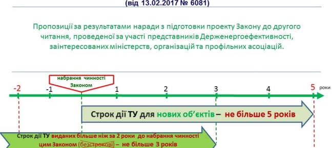 «Ідея законопроекту - обмежити строк дії технічних умов. У редакції законопроекту до першого читання цей термін становив 3 роки. Наразі під час доопрацювання законопроекту до другого читання прийнято рішення збільшити цей строк до 5 років», - повідомив С. Савчук, презентуючи законопроект на засіданні Комітету.
